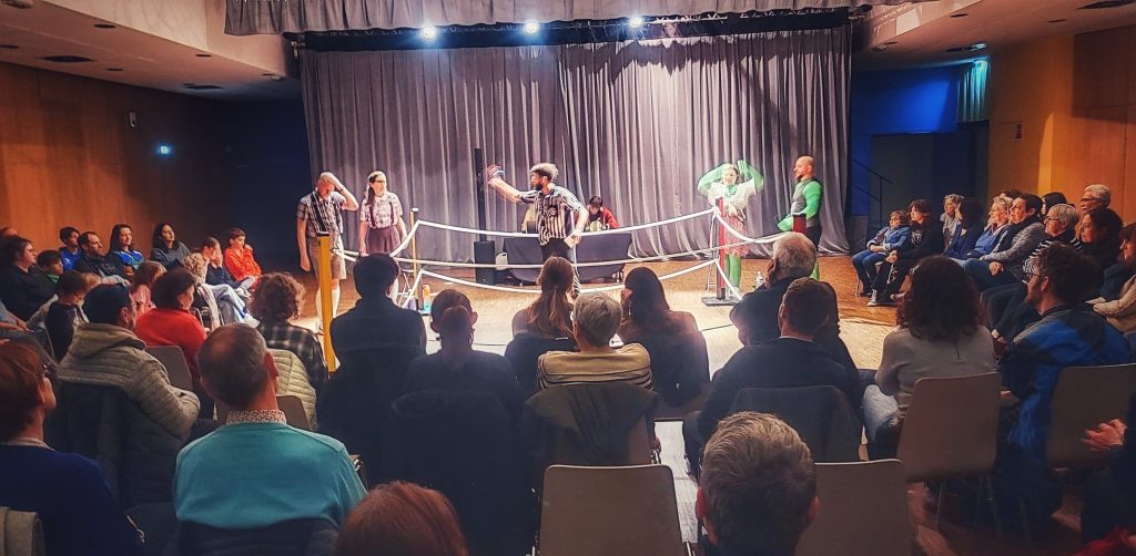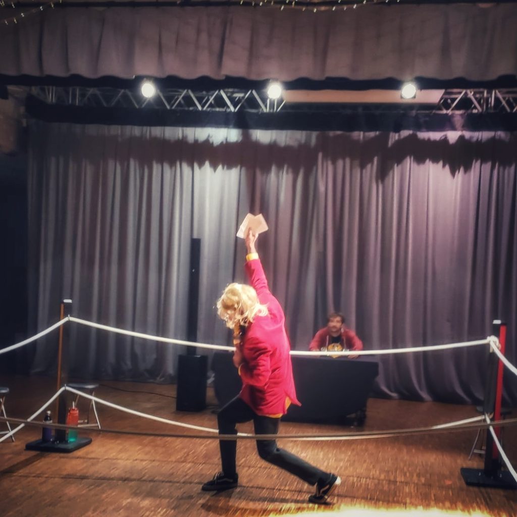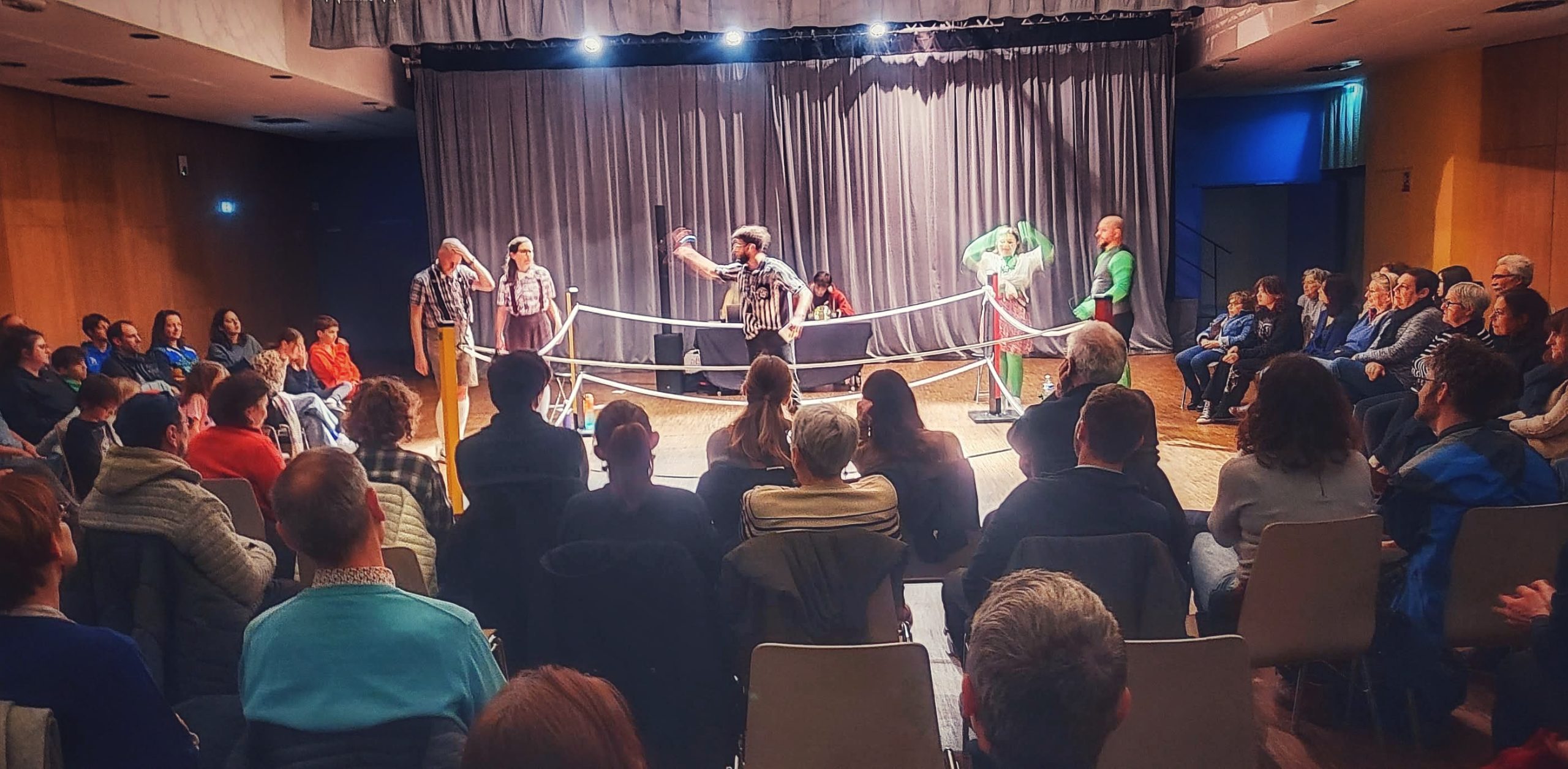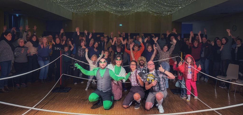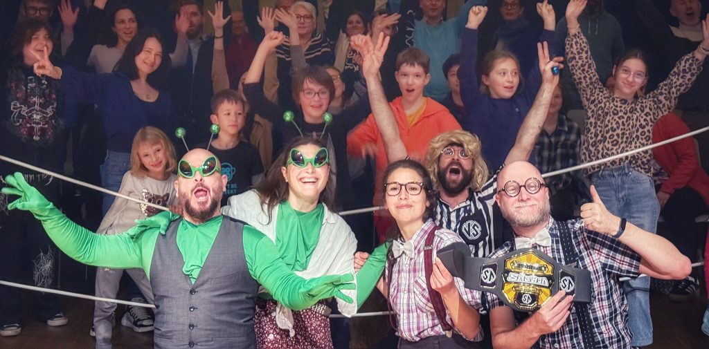 Le 14 Novembre dernier, la salle d’Ernolsheim-Bruche s’est transformée en véritable arène d’improvisation avec notre spectacle Versus, un catch d’impro survolté opposant deux duos hauts en couleur. D’un côté, en jaune, les Geek-Ass : de vrais premiers de la classe, lunettes bien ajustées, chemises à carreaux soigneusement rentrées, et une passion démesurée pour l’exactitude… même quand rien n’a de sens. De l’autre côté, en rouge, la Haute Sphère : deux extra-terrestres distingués, obsédés par les bonnes manières et la bienséance, même quand s’agit de faire ramasser ses fiches à l’arbitre.